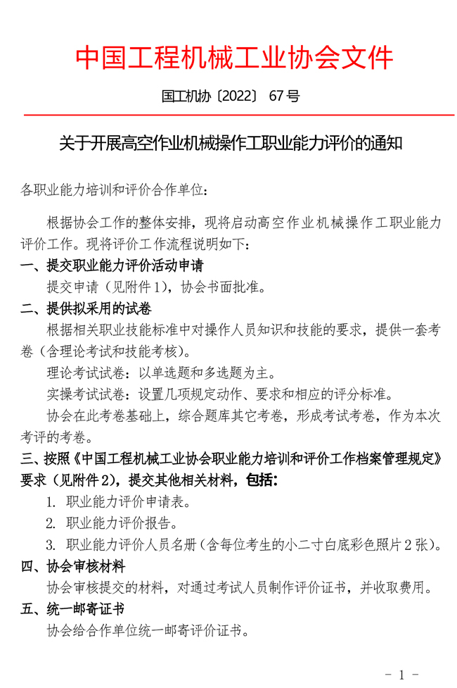 關于開展高空作業(yè)機械操作工職業(yè)能力評價的通知